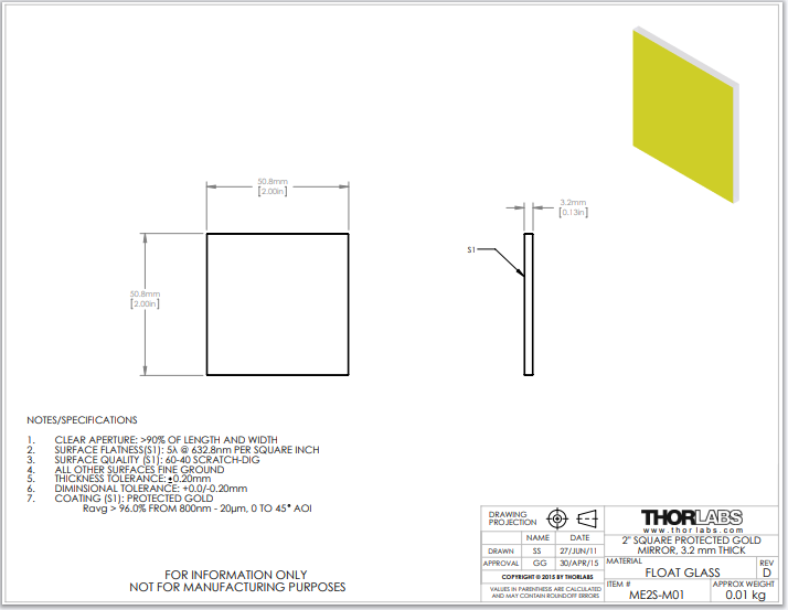 Thorlabs索雷博 ME2S-M01 方形平面反射镜