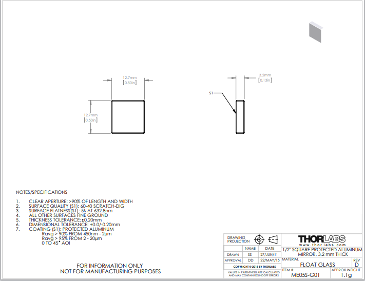 Thorlabs索雷博 ME05S-G01 方形平面反射镜