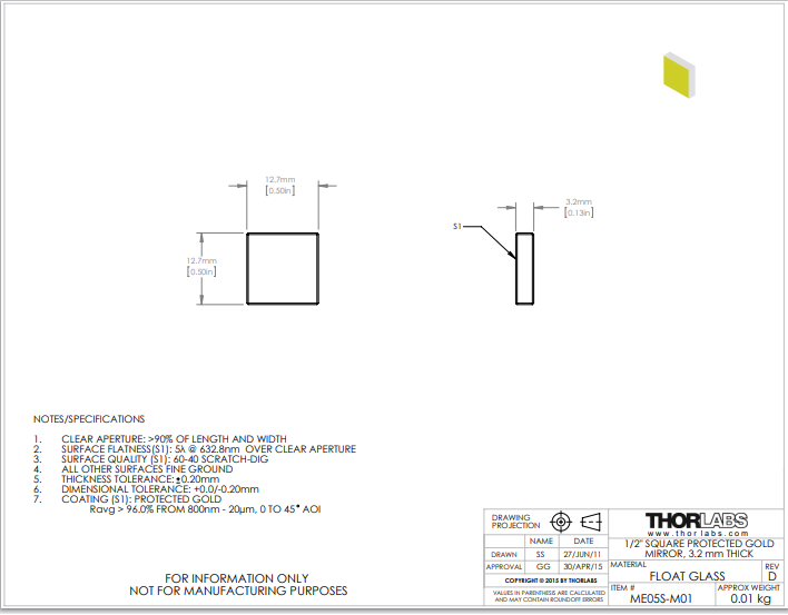 Thorlabs索雷博 ME05S-M01 方形平面反射镜