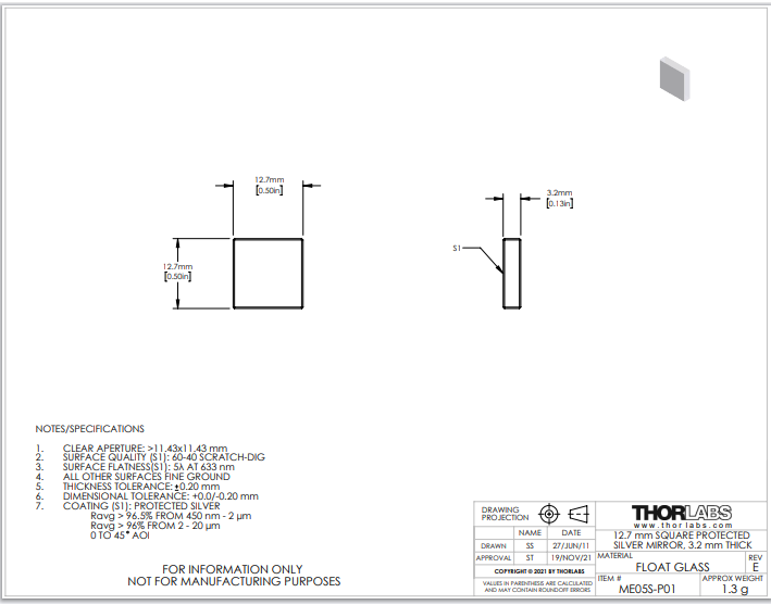 Thorlabs索雷博 ME05S-P01 方形平面反射镜