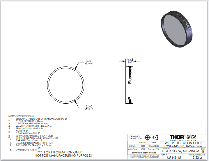 Thorlabs索雷博 MF445-45 WGFP激发滤光片