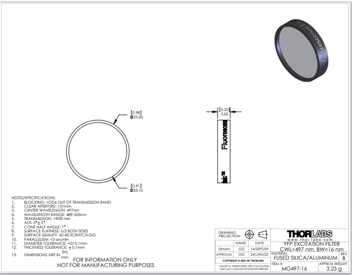 Thorlabs索雷博 MF497-16 YFP激发滤光片