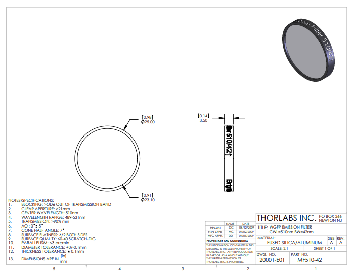 Thorlabs索雷博 MF510-42 WGFP发射滤光片
