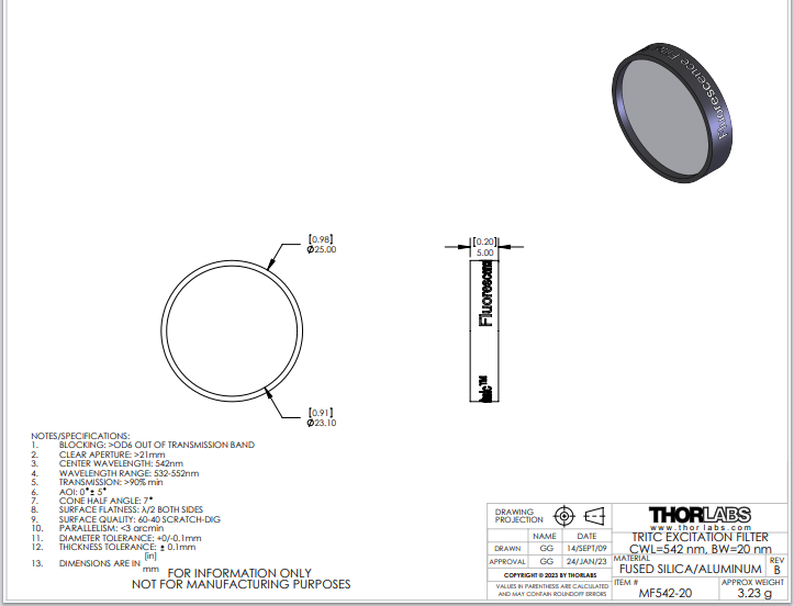 Thorlabs索雷博 MF542-20 TRITC激发滤光片