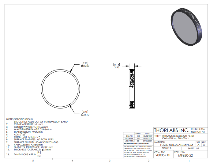 Thorlabs索雷博 MF620-52 TRITC/CY3.5发射滤光片