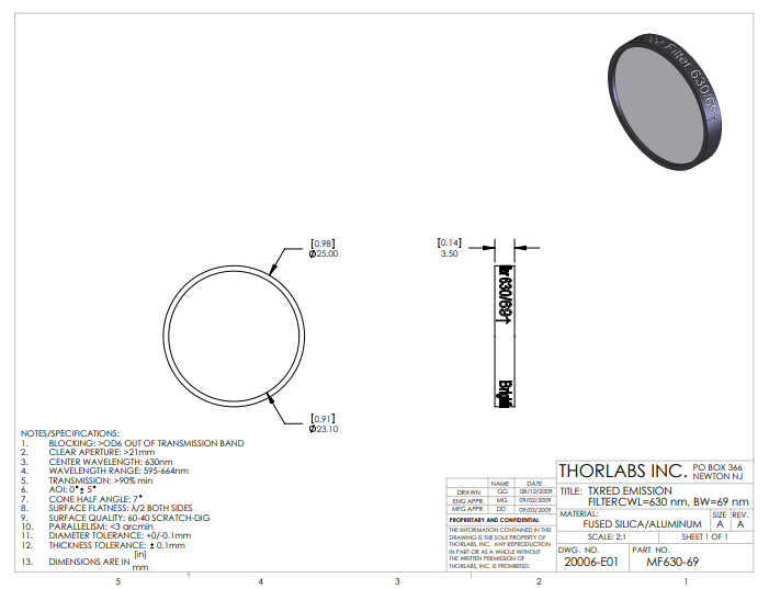 Thorlabs索雷博 MF630-69 TXRED发射滤光片