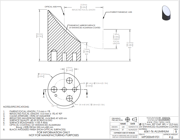 Thorlabs索雷博       MPD00M9-F01   Ø1/2英寸90°离轴抛物面镜