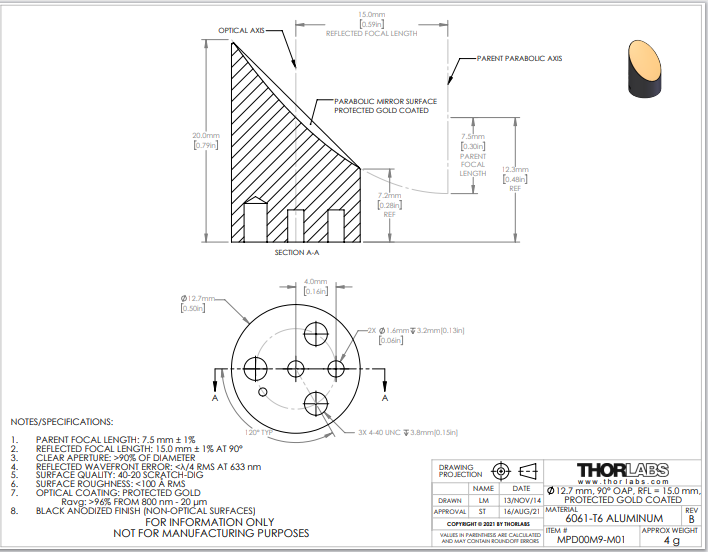 Thorlabs索雷博 MPD00M9-M01 Ø1/2英寸90°离轴抛物面镜