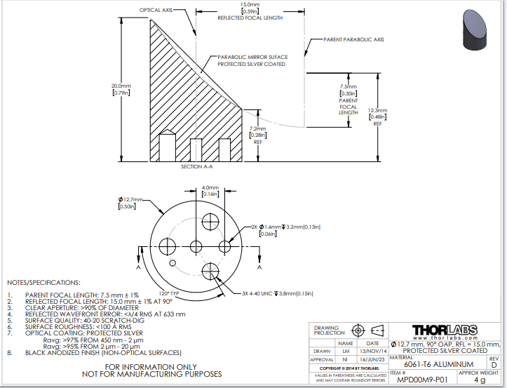 Thorlabs索雷博 MPD00M9-P01 90°离轴抛物面反射镜