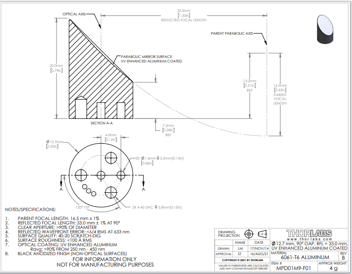 Thorlabs索雷博 MPD01M9-F01 Ø1/2英寸90°离轴抛物面镜