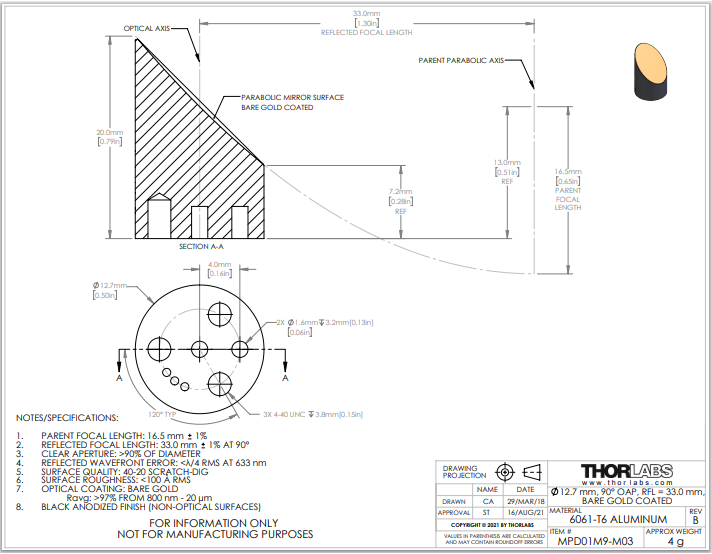 Thorlabs索雷博       MPD01M9-M03   90°离轴抛物面反射镜