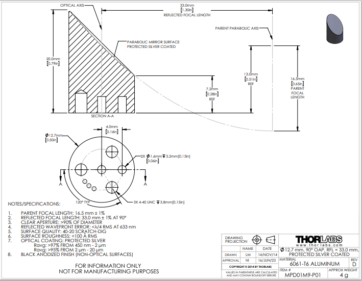 Thorlabs索雷博       MPD01M9-P01   90°离轴抛物面反射镜