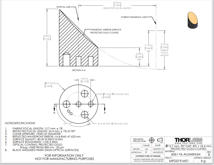 Thorlabs索雷博 MPD019-M01 Ø1/2英寸90°离轴抛物面镜