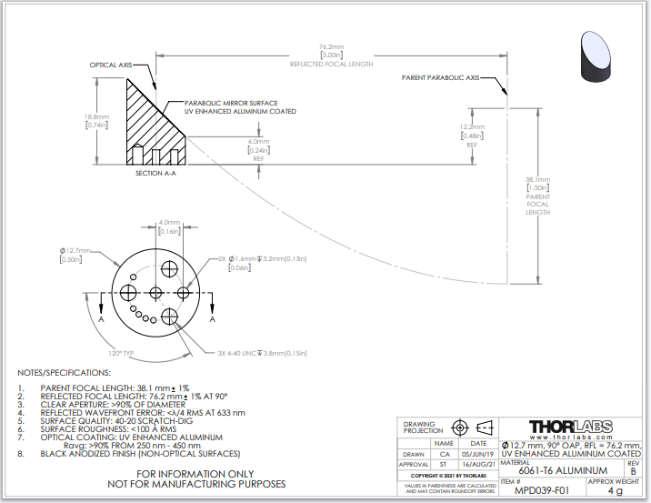 Thorlabs索雷博 MPD039-F01 Ø1/2英寸90°离轴抛物面镜