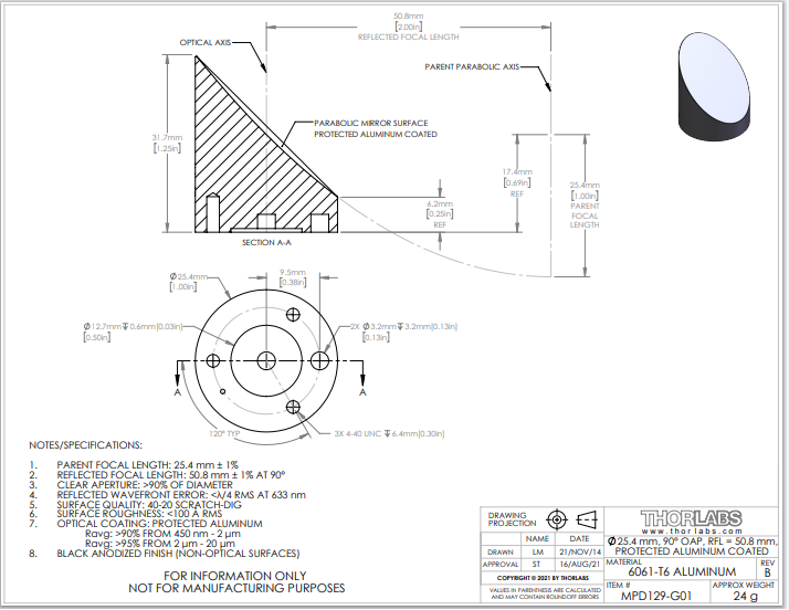 Thorlabs索雷博       MPD129-G01   Ø1英寸90°离轴抛物面镜
