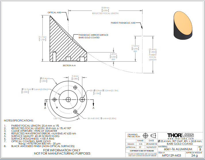 Thorlabs索雷博 MPD129-M03 90°离轴抛物面反射镜