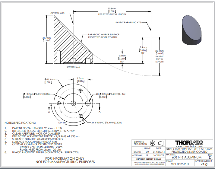 Thorlabs索雷博 MPD129-P01 90°离轴抛物面反射镜