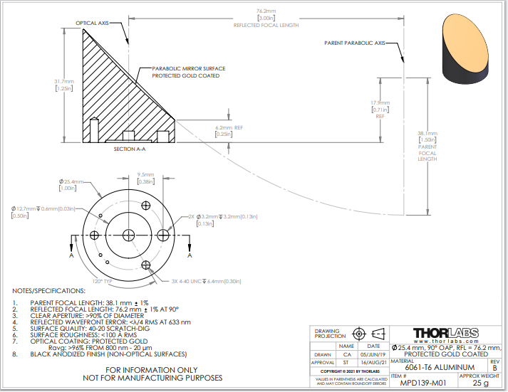 Thorlabs索雷博 MPD139-M01 Ø1英寸90°离轴抛物面镜