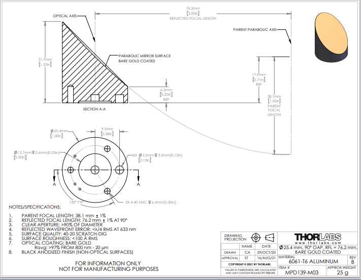 Thorlabs索雷博 MPD139-M03 90°离轴抛物面反射镜