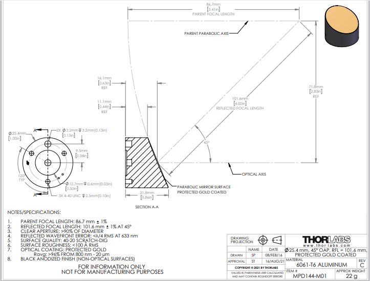 Thorlabs索雷博 MPD144-M01 45°,Ø1英寸离轴抛物面镜