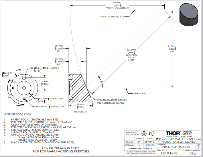 Thorlabs索雷博 MPD144-P01 离轴抛物面反射镜