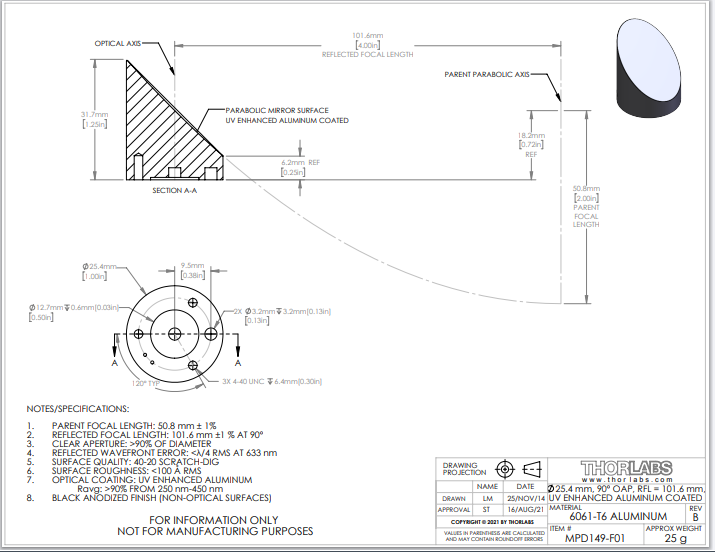 Thorlabs索雷博 MPD149-F01 Ø1英寸90°离轴抛物面反射镜