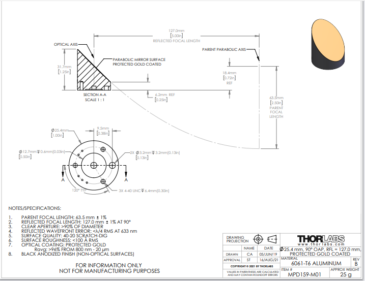 Thorlabs索雷博 MPD159-M01 Ø1英寸90°离轴抛物面镜