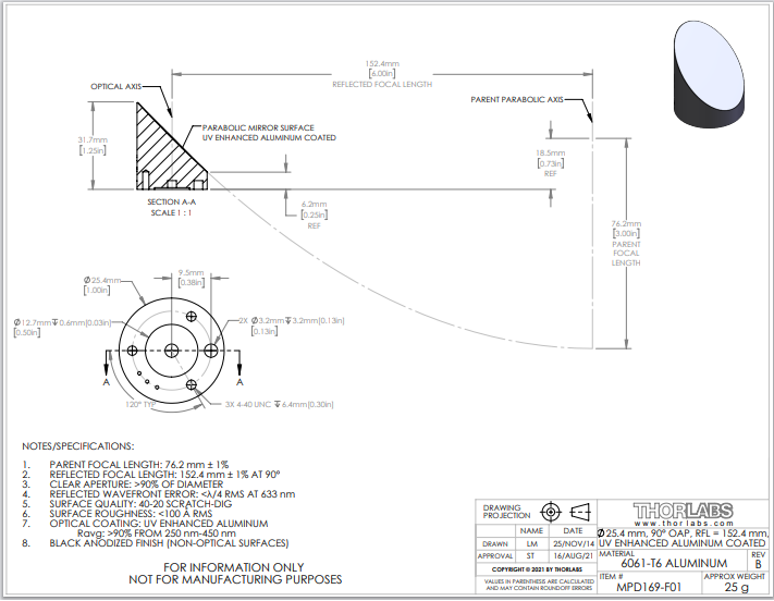 Thorlabs索雷博 MPD169-F01 Ø1英寸90°离轴抛物面镜