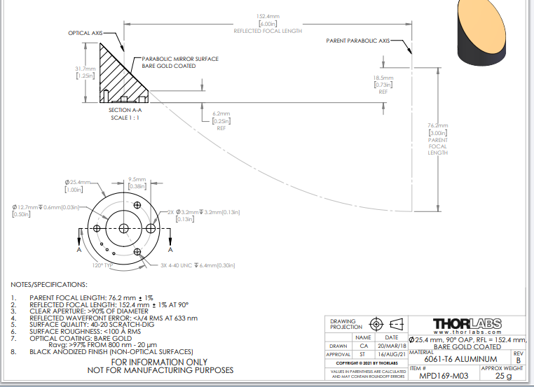 Thorlabs索雷博 MPD169-M03 90°离轴抛物面反射镜