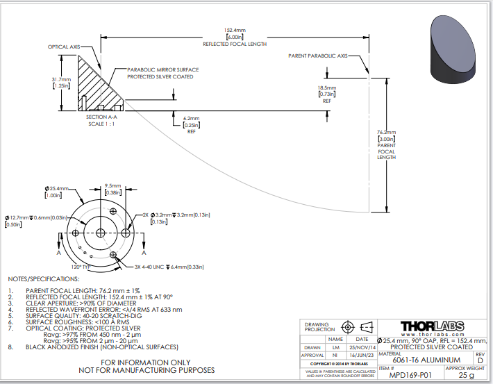 Thorlabs索雷博 MPD169-P01 90°离轴抛物面反射镜