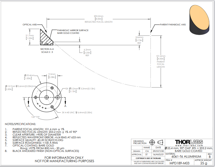 Thorlabs索雷博 MPD189-M03 90°离轴抛物面反射镜