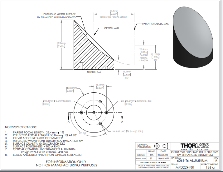 Thorlabs索雷博 MPD229-F01 Ø2英寸90°离轴抛物面镜