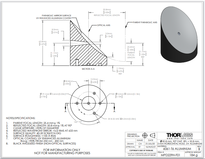 Thorlabs索雷博       MPD229H-F01   90°离轴抛物面反射镜