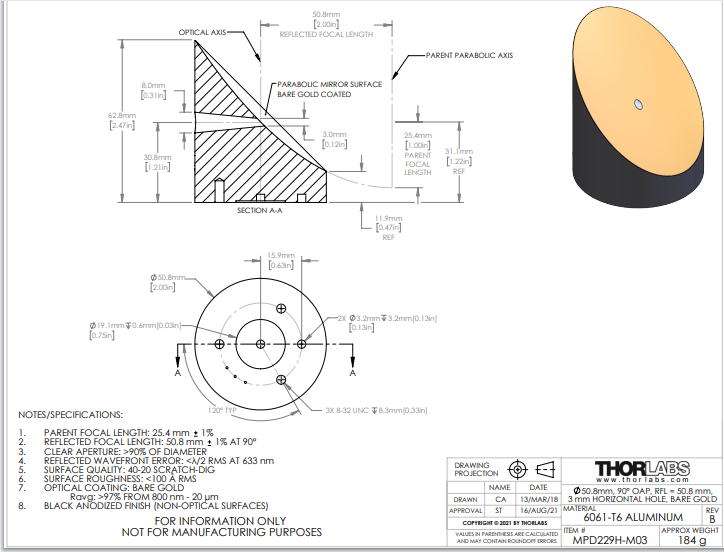 Thorlabs索雷博 MPD229H-M03 90°离轴抛物面反射镜