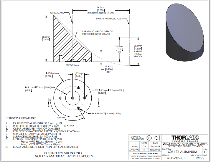 Thorlabs索雷博       MPD239-P01   90°离轴抛物面反射镜