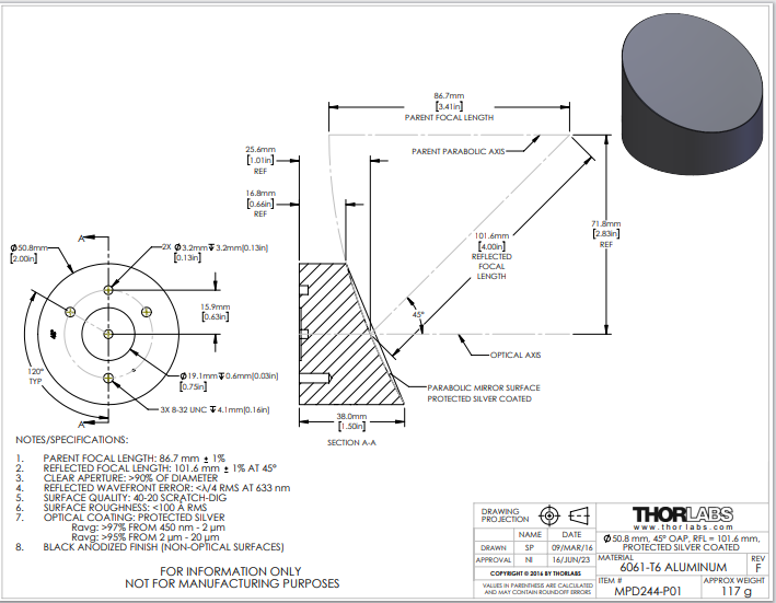 Thorlabs索雷博 MPD244-P01 离轴抛物面反射镜