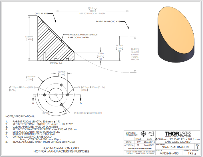 Thorlabs索雷博 MPD249-M03 90°离轴抛物面反射镜