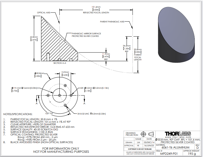 Thorlabs索雷博 MPD249-P01 90°离轴抛物面反射镜