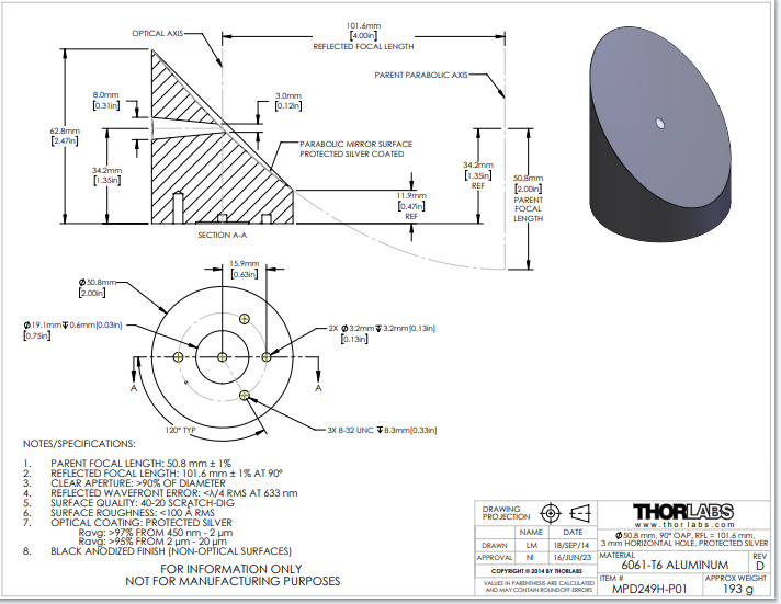 Thorlabs索雷博       MPD249H-P01   Ø2英寸90°离轴抛物面反射镜