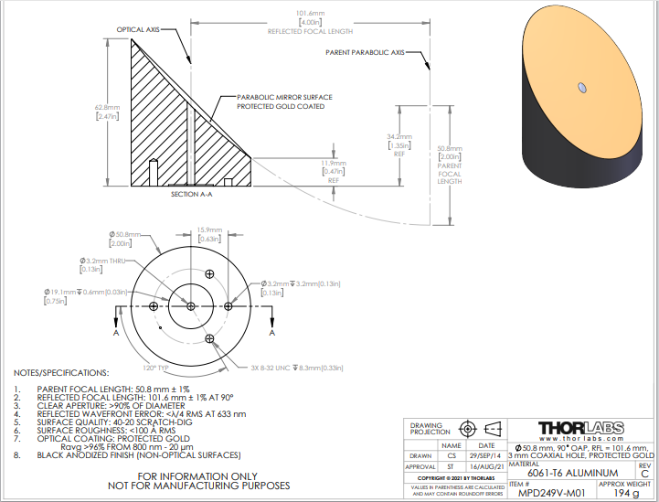 Thorlabs索雷博 MPD249V-M01 90°离轴抛物面反射镜
