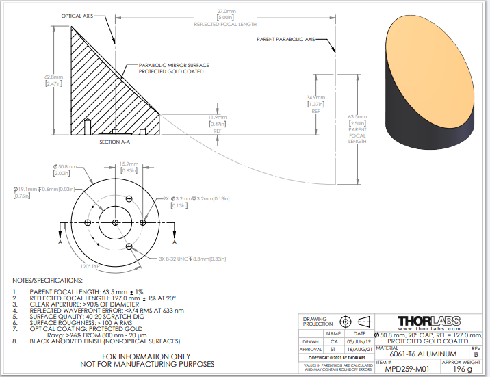 Thorlabs索雷博 MPD259-M01 Ø2英寸90°离轴抛物面镜