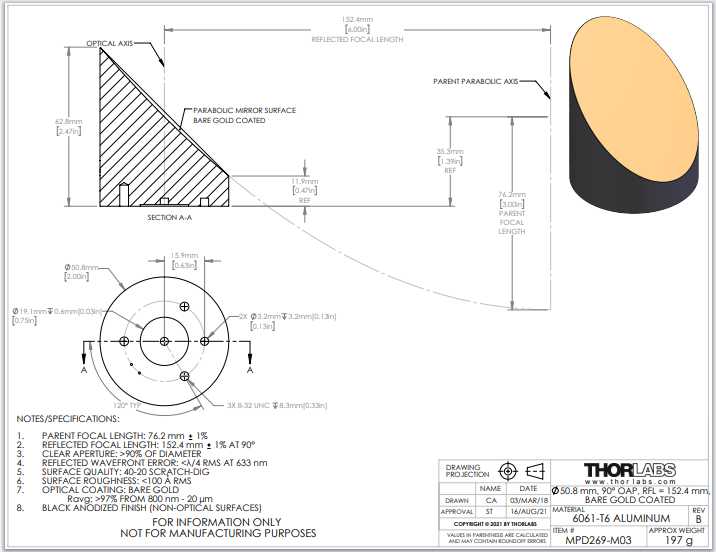 Thorlabs索雷博 MPD269-M03 90°离轴抛物面反射镜