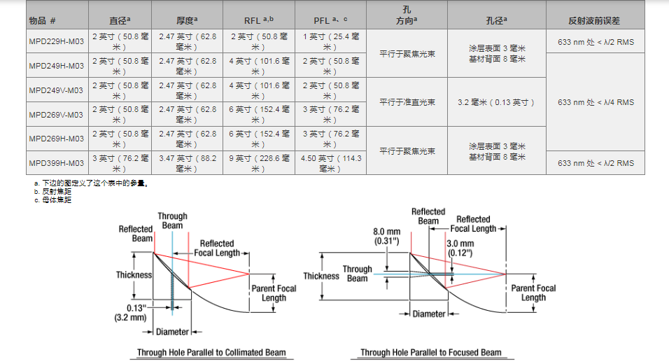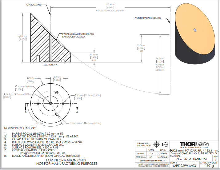 Thorlabs索雷博 MPD269V-M03 90°离轴抛物面反射镜