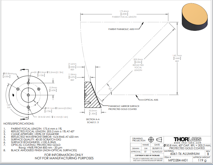 Thorlabs索雷博 MPD284-M01 45°,Ø2英寸离轴抛物面镜