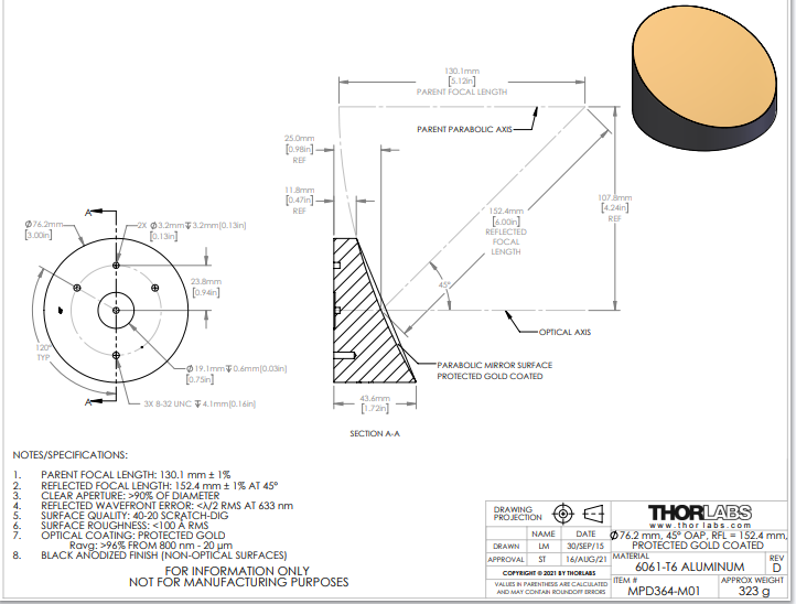 Thorlabs索雷博       MPD364-M01   45°,Ø3英寸离轴抛物面镜