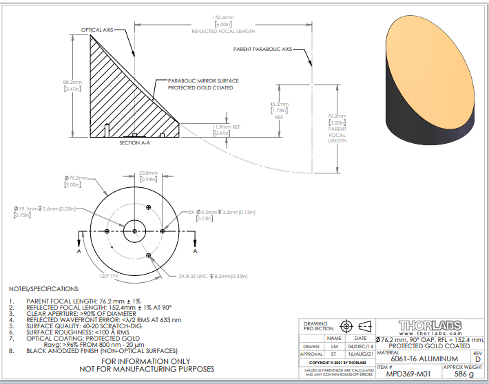 Thorlabs索雷博 MPD369-M01 Ø3英寸90°离轴抛物面镜