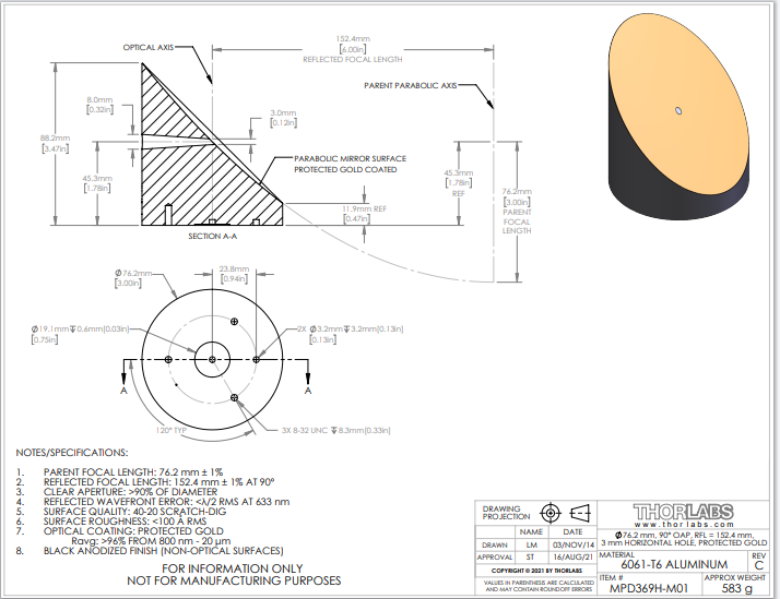 Thorlabs索雷博       MPD369H-M01   90°离轴抛物面反射镜