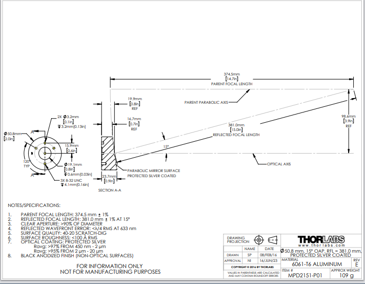 Thorlabs索雷博 MPD2151-P01 离轴抛物面反射镜