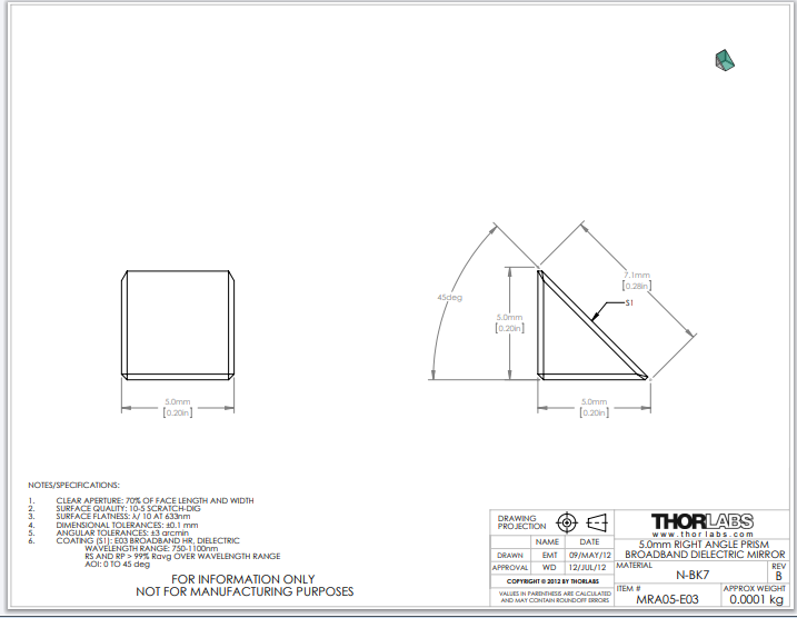 Thorlabs索雷博       MRA05-E03   直角棱镜反射镜