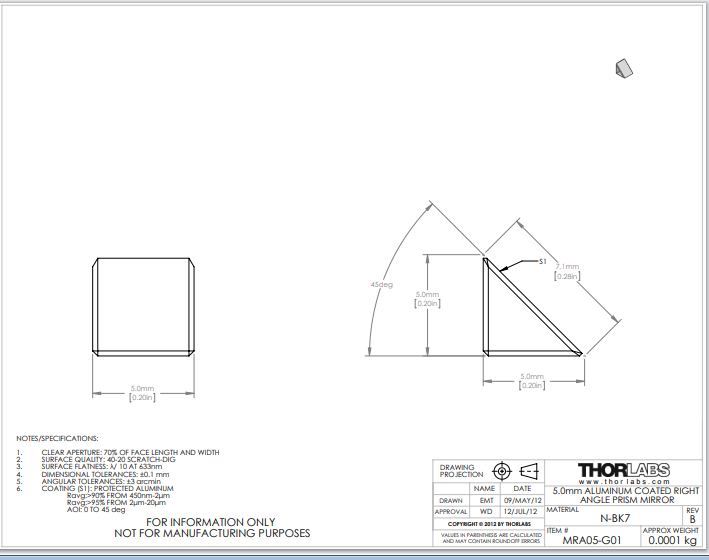 Thorlabs索雷博 MRA05-G01 直角棱镜反射镜